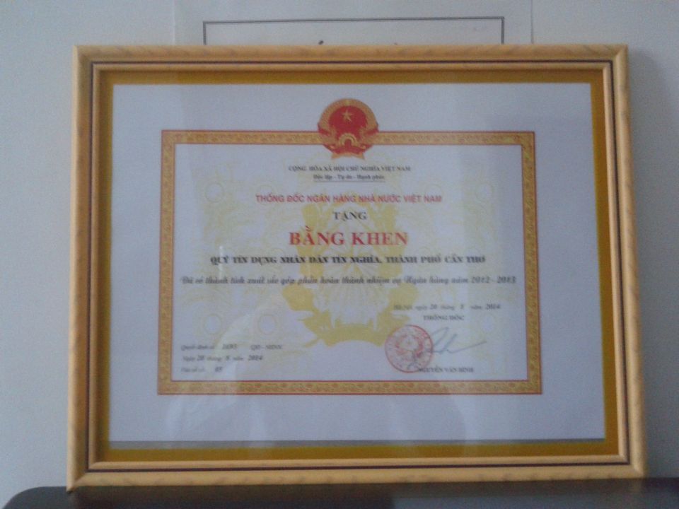 Ngày 20/08/2014 QTD Tín Nghĩa đã vinh dự đón nhận bằng khen của Thống Đốc NHNN trao tặng “đã có thành tích xuất sắc góp phần hoàn thành nhiệm vụ Ngân hàng năm 2012 – 2013“